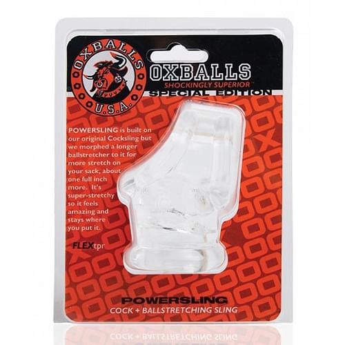 Powersling is built on our original Cocksling but we morphed a longer ballstretcher to it for more stretch on your sack, about one full inch more. It is super stretchy so it feels amazing and stays where you put it.