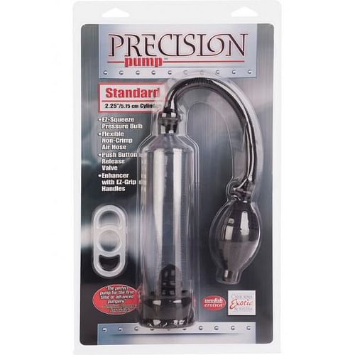– 8 x 2.25/20.25 cm x 5.75 cm (cylinder)- The perfect pump for the first time or advanced pumpers – American Pumpers Association- Clear vacuum cylinder with universal incremental measurements- EZ-Squeeze pressure bulb with push button release valve- Flexible non-crimping air hose- Flanged base with removable soft ribbed donut- Stretchy enhancer with EZ grip handles- SAN (cylinder), Silicone (enhancer, donut), Phthalate-Free PVC (hose), Rubber (bulb)