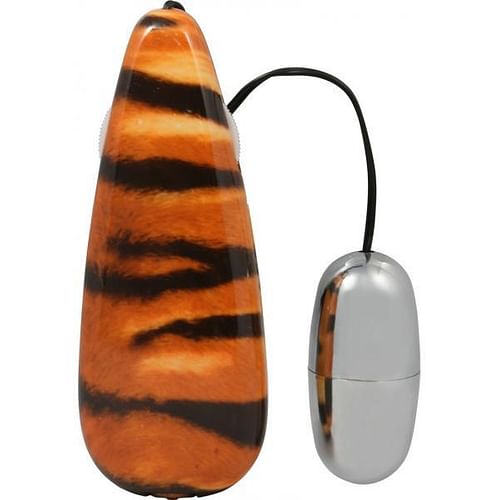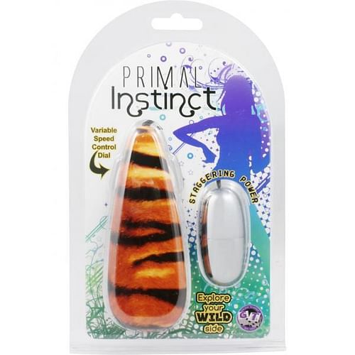 Explore your wild side! Primal Instincts series of bullet vibrators. Traditional silver bullet vibrator comes with an attached fun tiger print power supply. Feeling animalistic? Explore your wild side with Primal Instinct. Featuring a variable speed control and a staggeringly powerful bullet, you can’t help but go wild. Vibrating Bullet measures 2 inches long by 1 inch wide. Bulk weight 2.5 ounces. Vibrating sex toy requires 2 AA batteries, not included. Bullet vibrator is made using phthalate free, non-toxic materials ABS plastic. Variable speed power of vibrations. Staggering power. Primal Instincts Tiger Bullet Vibrator from Golden Triangle Novelties. GT Adult Toys For Everyone.