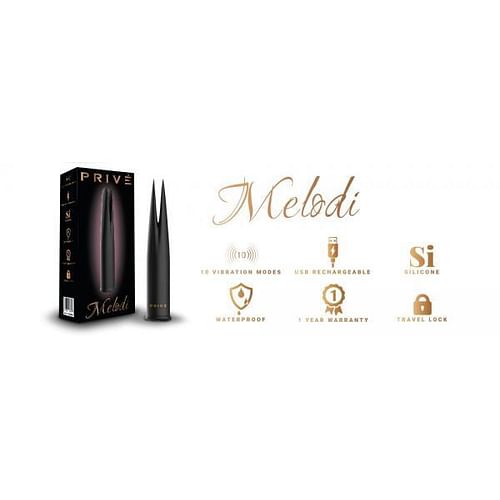 Prive Melodi from Prive Toys. An instrument of pleasure like no other. The Melodi Vibrator features an intense super charged motor with 10 vibration modes. The flexible velvety soft double tongue surrounds and teases your most sensitive parts. You will be hitting those high notes before you know it.