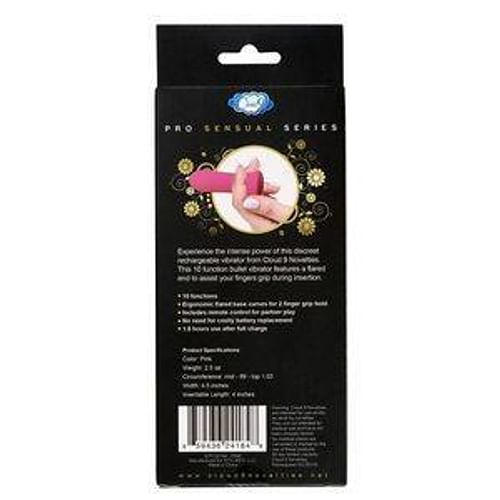 Pro Sensual Power Touch Bullet with Remote Control. Experience the intense power of this discreet rechargeable vibrator from Cloud 9 Novelties. This 10 function bullet vibrator features a flared end to assist your fingers grip during insertion. Features: 10 functions. Ergonomic flared base curves for 2 finger grip hold. Includes remote control for partner play. No need for costly battery replacement. 1.5 hours use after full charge. 2.5 ounces bulk weight. Circumference middle of vibrator .89 inch to top 1.03 inches. Width 4.5 inches. 4 inches insertion length. Color Pink.