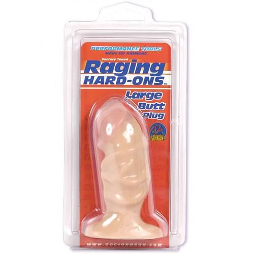 Large curved beige rubber butt plug with thick veined texture and a pink head on a wide base. The Large Butt Plug is 4 1/2 long (4 insertable) and 1.5 thick (including the ridges).