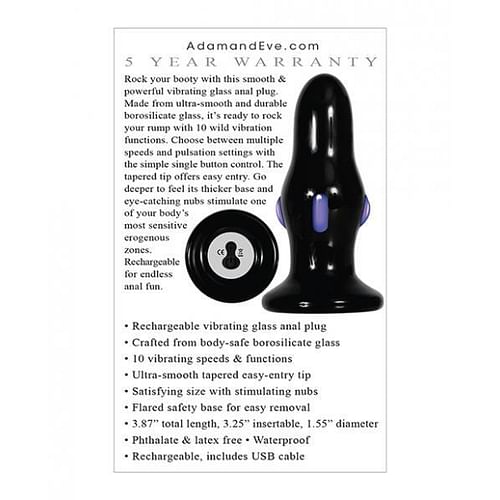 Rear Rocker Vibrating Anal Plug from Adam and Eve Toys by Evolved Novelties. Explore your back door pleasure with this beautiful, sleek, black glass plug. Its nonporous, body safe and ready to rock your rump in 10 mild to wild speeds with a simple one button control at its base. The long, tapered end delivers a smooth, easy entry while the center gradually swells out to make sure you stimulate all the sensitive nerve endings around this unique erogenous zone. Navigate with the flared safety base and colorful glass nubs at the mid-line to discover how you can take your orgasmic intensity to the next level! Vibrating glass anal plug .Perfect for exploring back door play. Made from body safe Borosilicate Glass. Detail made from durable ABS plastic. 10 vibrating speeds and functions. Colorful nubs around center help grip. Flared base for safety. White LED illuminates button during use. Size height 3.87 inches, depth 1.98 inches, width 1.98 inches. 3.25 inches insertion length, 1.55 inches diameter. Weight under .5 pound 4.8 ounces. Phthalate free and latex free. Rechargeable, USB cable included. Waterproof vibrations. 5 years warranty. Evolved Novelties – Adam and Eve Toys. Video. 2022.