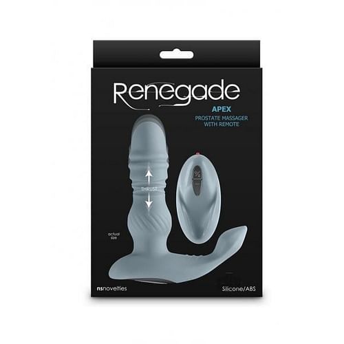 Reach new heights with Apex by Renegade. A stylish and inviting massager designed to stimulate the prostate and testicles with precise thrusts and vigorous vibrations. Apex is made of sumptuously smooth body-safe silicone and includes a wireless remote for countless exciting possibilities. Remote requires 1 AAA battery (not included). Rechargeable. 6 speeds / 8 functions. Suitable for use with all lubricants, including silicone.