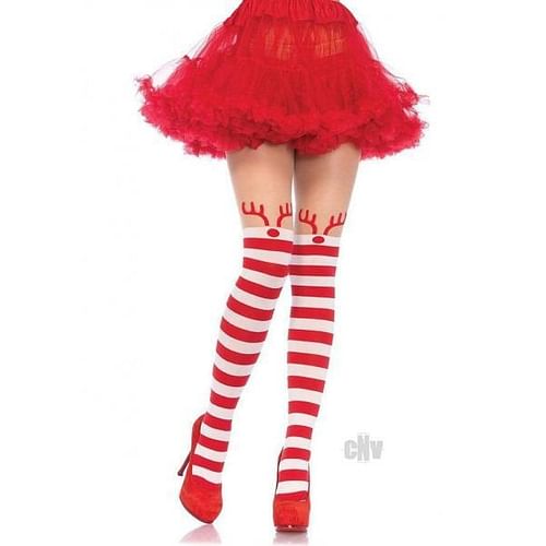 Rudolph reindeer opaque striped pantyhose w/sheer thigh high