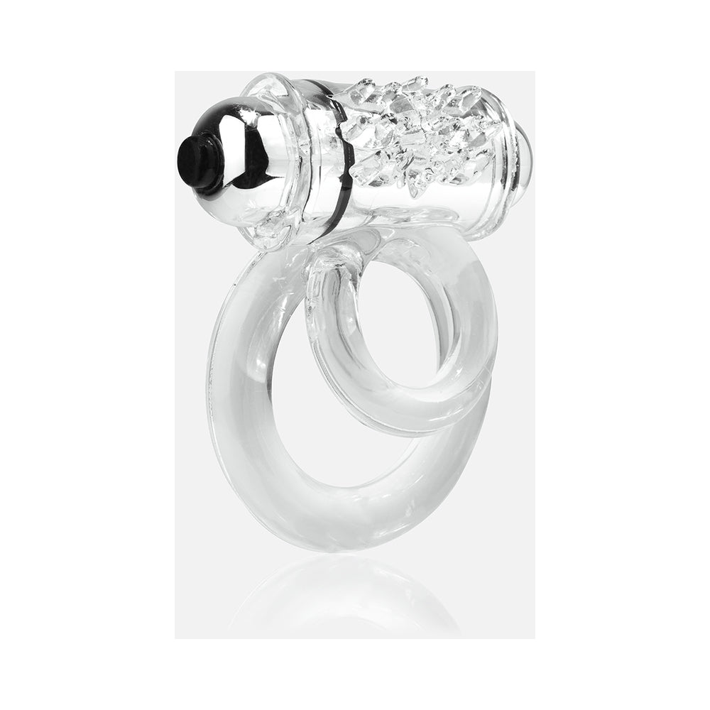 The DoubleO 6 vibrating erection ring features two specially positioned rings for an extra-secure fit G?? simply stretch one around the shaft and the other around the testicles. Featuring a super-powered bullet motor and raised pleasure ticklers, the DoubleO 6 gives couples super-powered pleasure right where it counts! COLOR: CLEAR