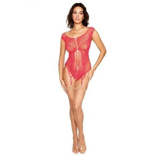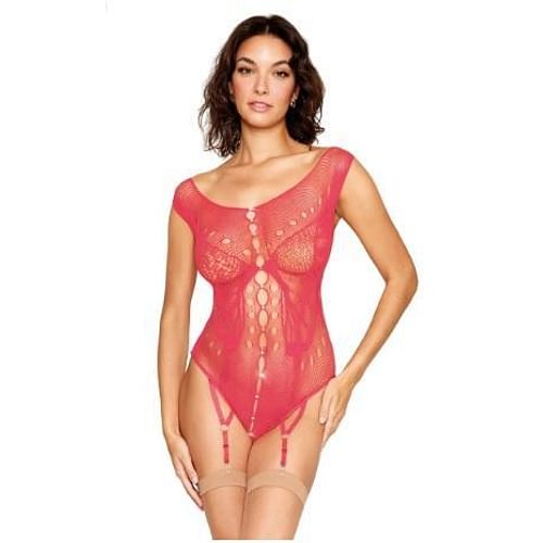 Seamless butterfly garter teddy with bateau neckline and front rhinestone accentsOpen-crotch teddy with front and back keyhole cutoutsAdjustable garters with silver metal O-ring details