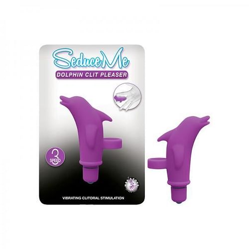 Seduce Me Dolphin Clitoris Pleaser Purple Finger Vibrator features 3 speed. Vibrating Dolphin clitoral stimulation. Waterproof vibrations. Made using body safe, phthalates free RoHs compliant material sleeve Silicone, Bullet vibrator ABS plastic. Size total length 3.5 inches. Vibrator requires 3 AG13/LR44 batteries, included.