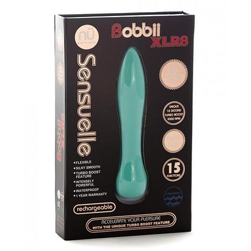 Sensuelle Bobbii XLR8 Blue Vibrator. Accelerate your pleasure with the unique turbo boost. Unique 12 second turbo boost. USB Rechargeable vibrator features 15 functions of deep throbbing and pulsating action. Plus pulsating action. Plus this power packed bullet is also flexible so you can adjust it to your unique shape. Ultra smooth, silky, sensual touch in a flexible design. Waterproof vibrations. 1 year warranty.