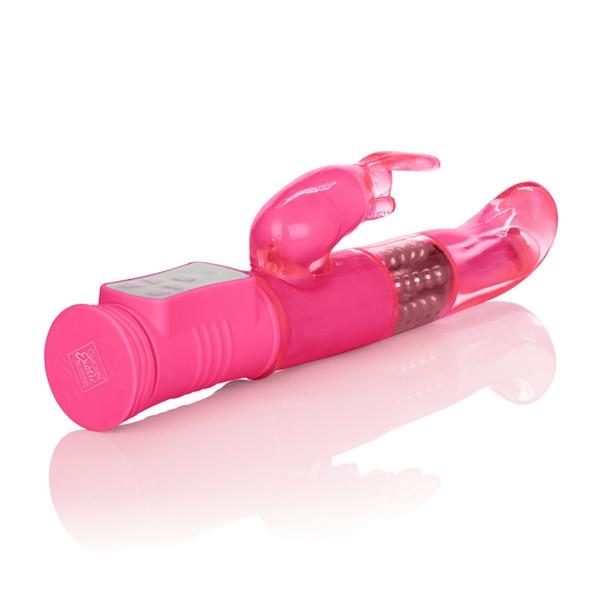 World famous Jack Rabbit with an accentuated G-spot curve. Sized for beginner, intermediate, and advanced users. 8 intense functions of vibration, pulsation and escalation. 4 speeds of independent shaft rotation. 5 rows of non-jamming, rotating beads. Easy to use LED control panel. Safe and pure for body and pleasure made using phthalate free materials Thermoplastic Elastomers TPE massager, ABS plastic with polyurethane PU Cote controller, Steel beads. Requires 4 AAA batteries, not included. Size 4.5 inches by 1.25 inches shaft. 2.5 inches by 1 inch rabbit.