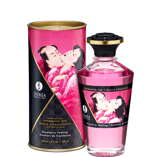 Shunga Erotic Art Aphrodisiac Warming Massage Oil Raspberry Feeling 3.5 fluid ounces. Edible oil for erogenous zones. Perfect for use on erogenous zones. Breath activated warming. Exquisite taste. Heightens the senses. A delicious edible warming oil created especially to excite erogenous zones. Activate by the warm breath of soft intimate kisses.