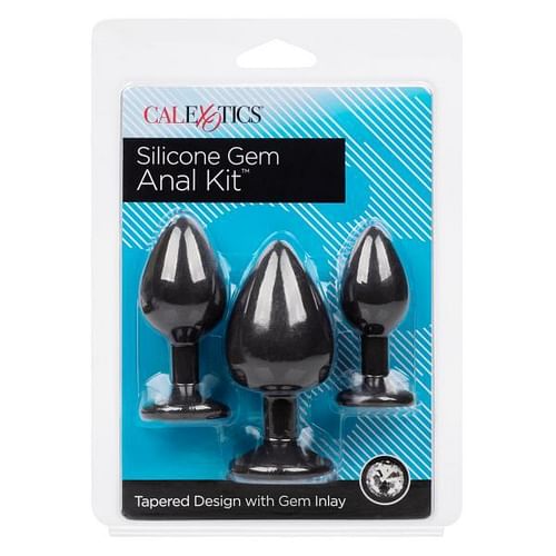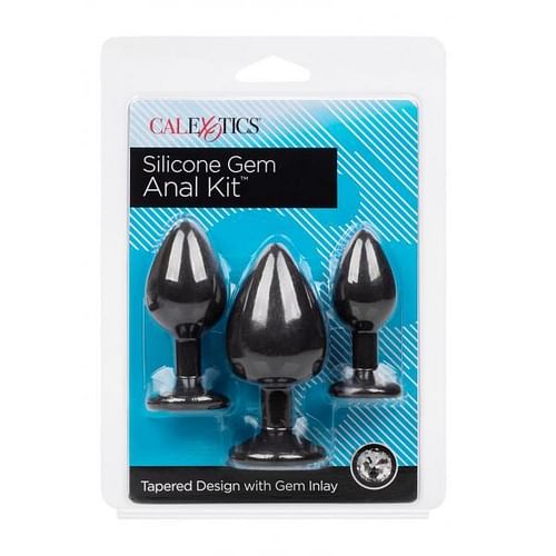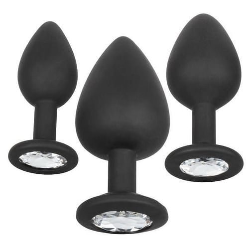 Pure silicone anal training kit with Satin Finish Designed for comfort and extended wear 3 graduated sizes tapered for a perfect fit. Flanged base with gem inlay. Smooth and seamless. Hygienically superior and body safe.