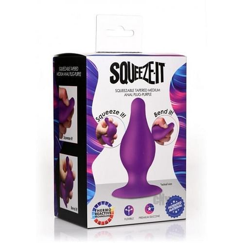 Satisfy your backdoor cravings with this plush, squeezable, flexible anal plug! The silky smooth texture of this premium silicone plug adds to the sensual experience you get when it enters your tight, little hole. The tapered tip makes insertion easy, however, and as long as you use a compatible water-based lubricant, slipping it in is pleasurable and simple. The squeezable and flexible features of this plug make it perfect for squeezing into tight corners and curves so it is completely form-fitting. Made with a blend of both silicone and silexpan, it is also temperature responsive! Heat it up for 30 seconds in the microwave or cool it down by placing it in the freezer to add temperature play into your backdoor fun! For those who want something a little different with their plugs, this plug is also strap-on harness compatible and has a strong, suction cup base due to its wide flange. So, if you like to pop the tip in and bounce on the round base, enjoy this unique feature! Heat up the plug in the microwave and grab some water-based lube. After spreading the lube on the toy and your backdoor, start to pop that plug into your dark star and slide it inside. Enjoy the satisfying fill of this flexible plug and play with popping it in and out to test your anal abilities! When you’re done playing, simply wash with warm water and mild soap, then spray with a toy cleaner and wipe dry. Store separately from any vaginal or oral toys. Measurements: LxWxH= 9.5 x 5.7 x 5.7 cm, Overall length: 3.7 inches, Insertable length: 3.3 inches, Widest insertable diameter: 1.6 inches Materials: Silicone and Silexpan Color: Purple Note: Use only with water-based lubricants for best results. When playing with temperature, do not expose anal tissue to extreme heat or cold.