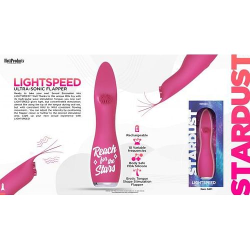 Stardust Light Speed Toy with Ultra Sonic Flapper Tongue Tip from Hott Products Unlimited. Reach for the stars. Ready to take your next sexual encounter into Lightspeed? Well, thanks to this unique little toy with its multi-pulse wave stimulation tongue, you now can! Light Speed gives light, but concentrated stimulation; almost like using the tip of the tongue during oral sex, but with consistent mild to wild consistent flowing movement. You can adjust the intensity by positioning the flapper closer or further to the desired stimulation area. Light up your next sexual experience with Light Speed! Features: Rechargeable vibrations. 10 variable frequencies. Made using body safe phthalate free FDA Silicone. Box measures 9 inches by 4 inches by 4 inches.