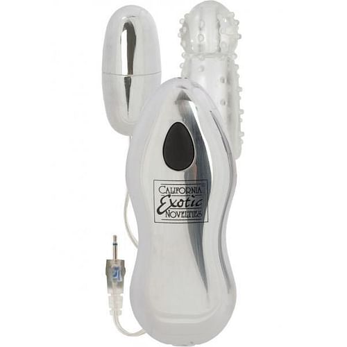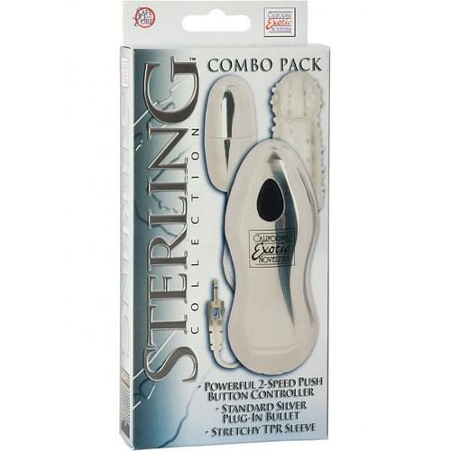 Powerful 2-speed push button controller with single plug-in jack Standard silver bullet Soft and stretchy bullet sleeve with pleasure bumps ABS with silver plating (controller and bullet) TPR (sleeve) Controller 4.5x 1.75/12 cm x 4 cm Bullet 2.25 x 1/6 cm x 3 cm 2 AA batteries