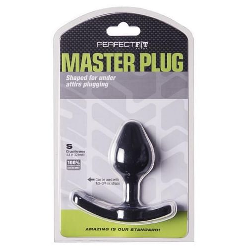 Perfect Fit Brand Strap On Butt Plug Small is shaped for under attire plugging. Master Plug and its a unique body countered butt plug that has features to allow it to be used with a strap from a thong or jock or Fetish clothing. Though it works great without a strap. It is most unique feature is the 2 part molding process, that allows us to use a strong thin inner core and over mold a softer Thermoplastic Rubber TPR plug with a very thin neck, making it extremely comfortable, flexible and strong. Truly a unique item it is designed for discreet under clothing fun. Small plug with a 4.8 inches circumference. Can be used with .50 inch and .75 inch straps.