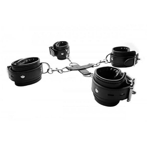 Strap your lover into this comfortable spreader bar to heighten the mood! Excite your sex life with this bondage positioning aid, designed to spread their ankles wide apart and trap their wrists between them. Imagine the possibilities! Put your play thing into doggy style or flip them over and use the device for leverage as you plow into them! Each of the adjustable cuffs is cushioned so that your partner will stay comfortable during long sessions of spankings, multiple orgasms, or whatever you have in mind! The locking buckles ensure that your lover will not escape until you are done with them!