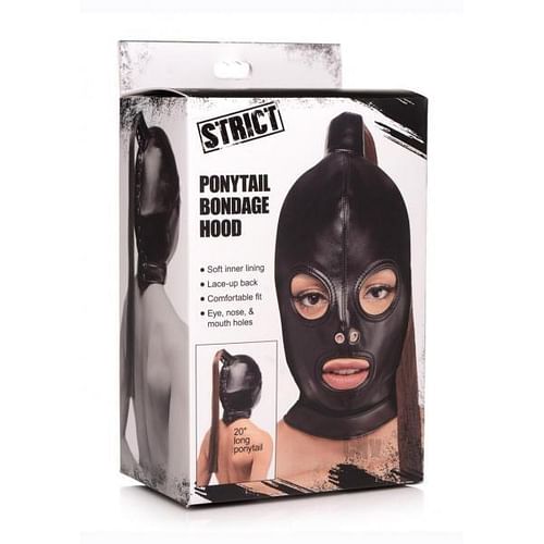 The Ponytail Bondage Hood features two eye holes, a pair of nostril breathing holes, and an open mouth hole so it will not hamper breathing or limit eyesight. The attached 20 inch silky ponytail is just begging to be grabbed and used to guide your sub wherever you want them!This hood is crafted to be comfortable and adjustable. The lace-up back makes it easy to find the perfect fit for all head shapes and sizes. Pull on your lovers ponytail without making them uncomfortable and bow them to your will!The inner lining is soft and flexible with an exterior made with lightweight PU leather for a comfortable fit and texture for stress-free extended sessions. Combine this hood with other Bondage accessories like wrist cuffs, spreader bars, and floggers for a genuine dungeon aesthetic and experience! Layer on a blindfold, gag, or both for endless fun.Measurements: Overall length 11 inches, overall width 11.5 inches, neck circumference 17 inches,Ponytail length 20 inchesMaterials: PU Leather, Metal (Nickel free)Color: Black