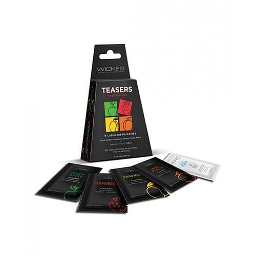 8 assorted flavored lube packettes with one bonus simply aqua – 2 each Candy Apple, Strawberry, Mango, Sweet Peach