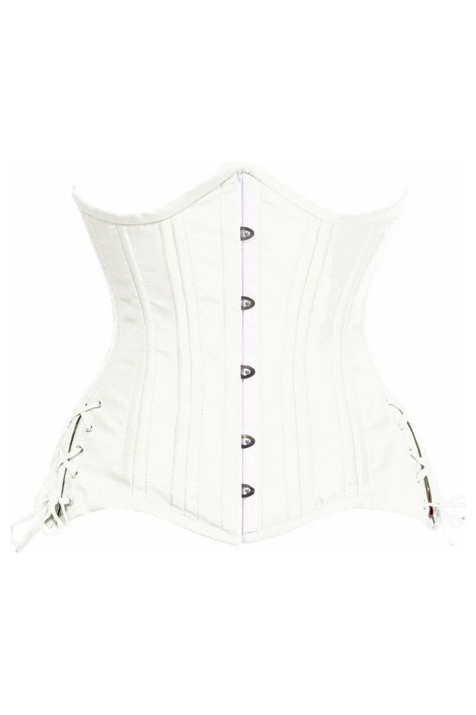 Top Drawer White Satin Double Steel Boned Curvy Cut Waist Cincher Corset w/Lace-Up Sides