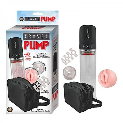 Travel Pump Clear is a compact travel kit. Specially designed motorized controller. 3 powerful suction settings. Vacuum release button 2 Interchangeable suction bases. Universal suction base. Realskin masturbator base. 4 tight cock rings. Discreet carrying case with handle. Made using phthalates free materials Pump Controller ABS plastic, Silicone, Cylinder PC, Suction Base, cock rings Thermoplastic Elastomers TPE, Vagina Masturbator Base Thermoplastic Rubber TPR, Carrying Case Nylon.
