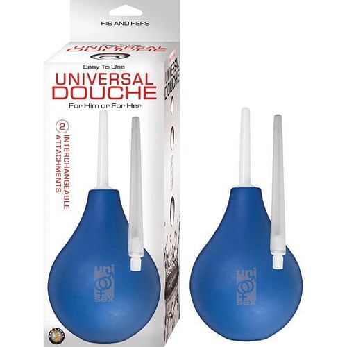 Universal Douche Blue from Nasstoys of New York. 2 interchangeable attachments. For him or for her. Easy push button control. Body safe silicone. Waterproof. Phthalates free materials attachments Polypropylene PP, Bulb Silicone. Size bulb 4.5 inches, Length of attachments 2 inches and 3.75 inches.