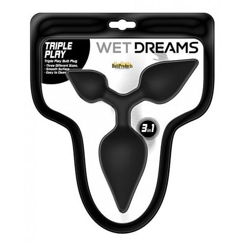 Triple Play Butt Plug is the perfect little Tushy Toy which allows the ??????End User?????? to go from gentle (Beginners) to Extreme (Seasoned Players) during intimate anal play. The smooth contoured shape and super soft material easily slips in without any discomfort and will leave both you and your lover More Than Satisfied, and Coming back for more! Features: Three Different Sizes, Easy To Clean, Super Soft TPR Material. From Hott Products.