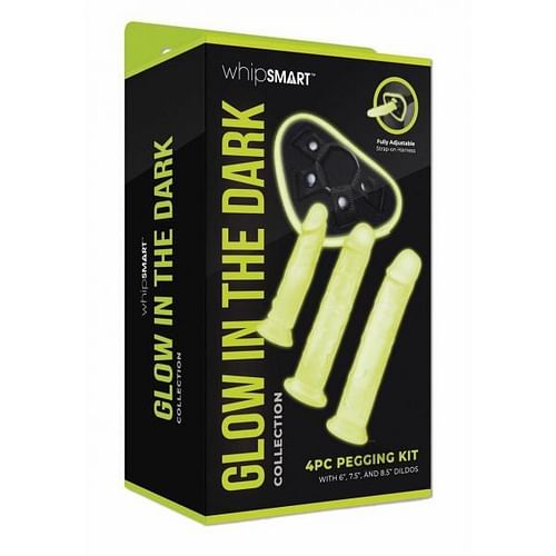 This glow-in-the-dark pegging set includes a fully adjustable strap-on harness with a snap-on O-ring to secure one of the included three dildos in graduated sizes in place. The dildos are also fun to use by themselves.