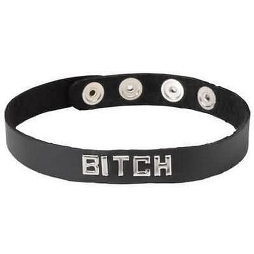 Make a statement without saying a word with this sassy leather collar. The comfortably slender band comes with four adjustment snaps to ensure a snug fit, and features a sassy saying in silvertone letter studs along the front. Perfect for a night at the club or a hot and heavy BDSM scene in the bedroom, this naughty collar will ensure all eyes are on you! Color: Black Material: Leather Reads: Bitch Closure: Snaps Special Features: Adjustable