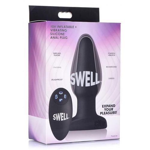 A classic tapered shape that gets bigger in your booty! Expand your pleasure with this inflatable and vibrating anal toy unlike any other. This silky-smooth silicone plug will gently swell within you for an unbelievable sensation of fullness. Treat yourself or your partner to 7 modes of vibration, including 3 speeds and 4 patterns. The remote control does it all, sending buzzes into you booty, as well as allowing you to find the perfect inflation point. Just hold down the button on the left to begin the ballooning, or press it more carefully for a slow, gradual growth. The button on the right will instantly deflate it back to its original size for a comfortable removal. Made of premium silicone, this Swell Plug is non-porous and phthalate-free for body-safety. Clean this splashproof pleasure tool with warm water and either toy cleaner or mild soap after use. Avoid use with silicone lubricants to preserve this material. Measurements: 5.5 inches in total length, 4.6 inches insertable length, 1.1 inches in diameter at stem, 1.6 inches at widest diameter deflated, 2 inches at widest diameter inflated Material: Silicone Color: Black Note: Charges via USB. Remote requires 2 AAA batteries, not included.