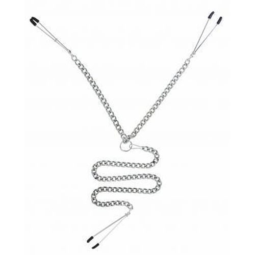 Adjustable rubber tipped tweezer style nipple clamps with detachable jewelry chain and clit clamp.